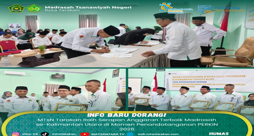 Tarakan (Humas MTsN Tarakan) — MTsN Tarakan kembali menorehkan prestasi membanggakan dengan meraih capaian serapan anggaran terbaik untuk kategori madrasah di Provinsi Kalimantan Utara. Penghargaan tersebut disampaikan dalam kegiatan rapat koordinasi dan evaluasi program dan anggaran tahun 2025 dirangkai penandatanganan perjanjian kinerja tahun anggaran 2026 yang berlangsung di Kantor Kementerian Agama Kota Tarakan, Senin (9/2/2026).