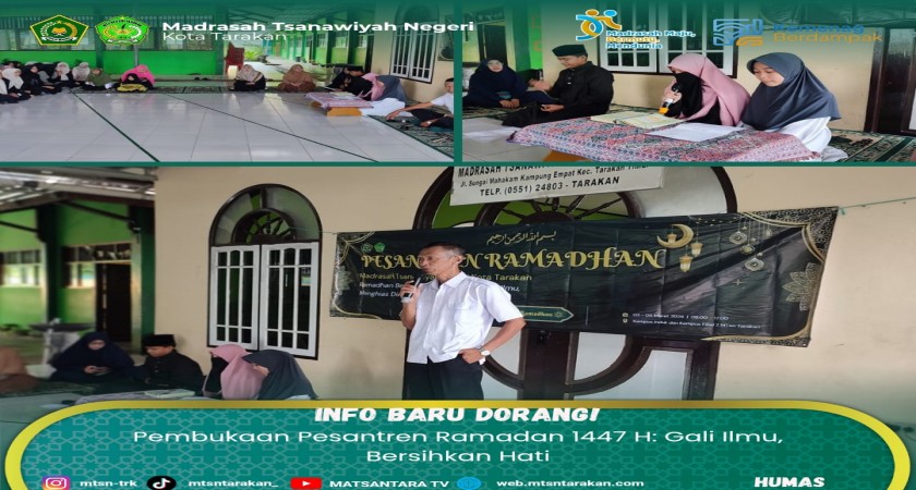 Tarakan (Humas MTsN) - Mulai hari ini, 2 Maret hingga 5 Maret 2026, seluruh siswa MTsN Tarakan mengikuti rangkaian kegiatan Pesantren Ramadan. Agenda ini dirancang untuk memperdalam pemahaman agama sekaligus memperkuat karakter siswa di bulan yang mulia ini.