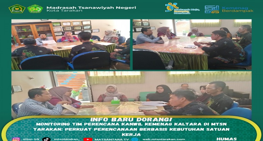 Tarakan (HUMAS MTsN)– MTs Negeri Tarakan menerima kunjungan Tim Perencana Kantor Wilayah Kementerian Agama Provinsi Kalimantan Utara dalam rangka kegiatan monitoring dan penguatan perencanaan program satuan kerja. Kegiatan ini berlangsung pada Rabu, 11 Maret 2026, mulai pukul 08.00 WITA hingga selesai, bertempat di Ruang Kepala MTs Negeri Tarakan.